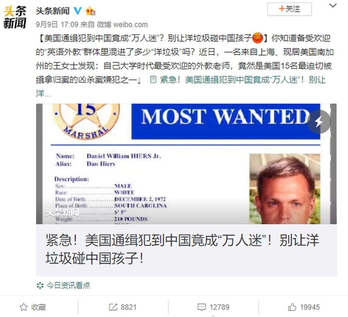Recently, Chinese social media and news outlets reported that the former cop was an English teacher at a prominent Shanghai school. Reports that Hiers is an accused killer and child molester in the U.S. enraged users on Weibo, China’s version of Twitter.