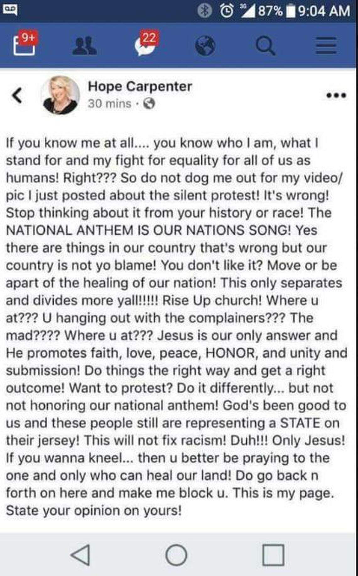 “The national anthem is our nations song! Yes there are things in our country that’s wrong but our country is not yo blame! You don’t like it? Move or be apart of the healing of our nation,” Carpenter posted on Facebook in response to NFL players protesting police violence against black Americans by kneeling during the playing of “The Star-Spangled Banner.” “This will not fix racism! Duh!!!”