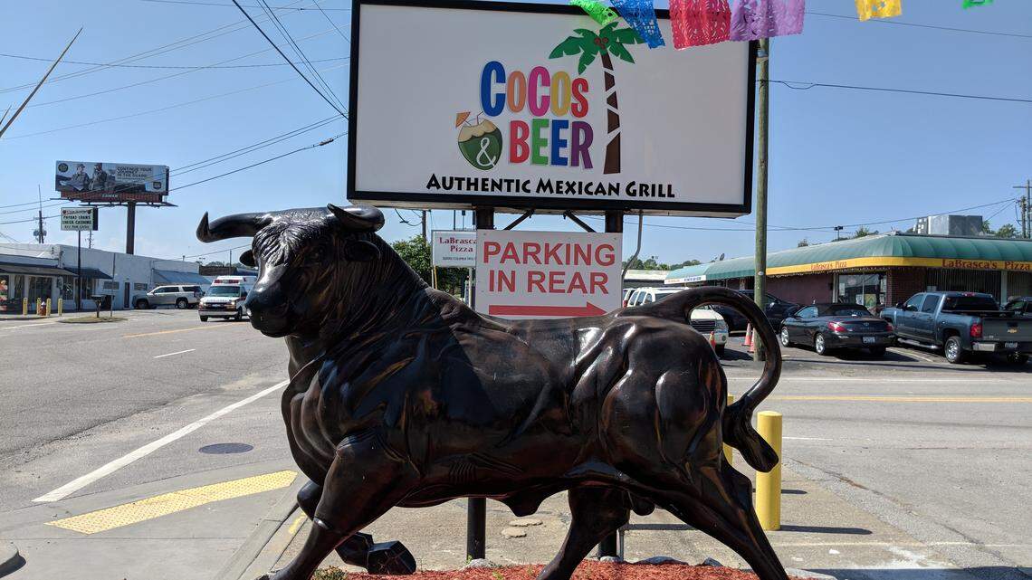 The restaurant’s unusual name comes from the popular combination of beer and coconuts in Mexico. It’s known for its wide selection of authentic Mexican dishes and a menagerie of margaritas, plus the large bull sculpture in the parking lot.