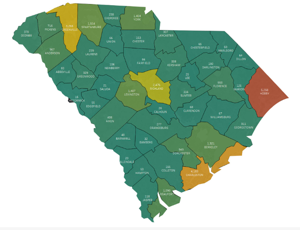 Workers in coastal counties Charleston and Horry — which rely heavily on the hospitality and tourism industries — filed the most claims: 4,183 from Charleston County and 5,258 in Horry County.