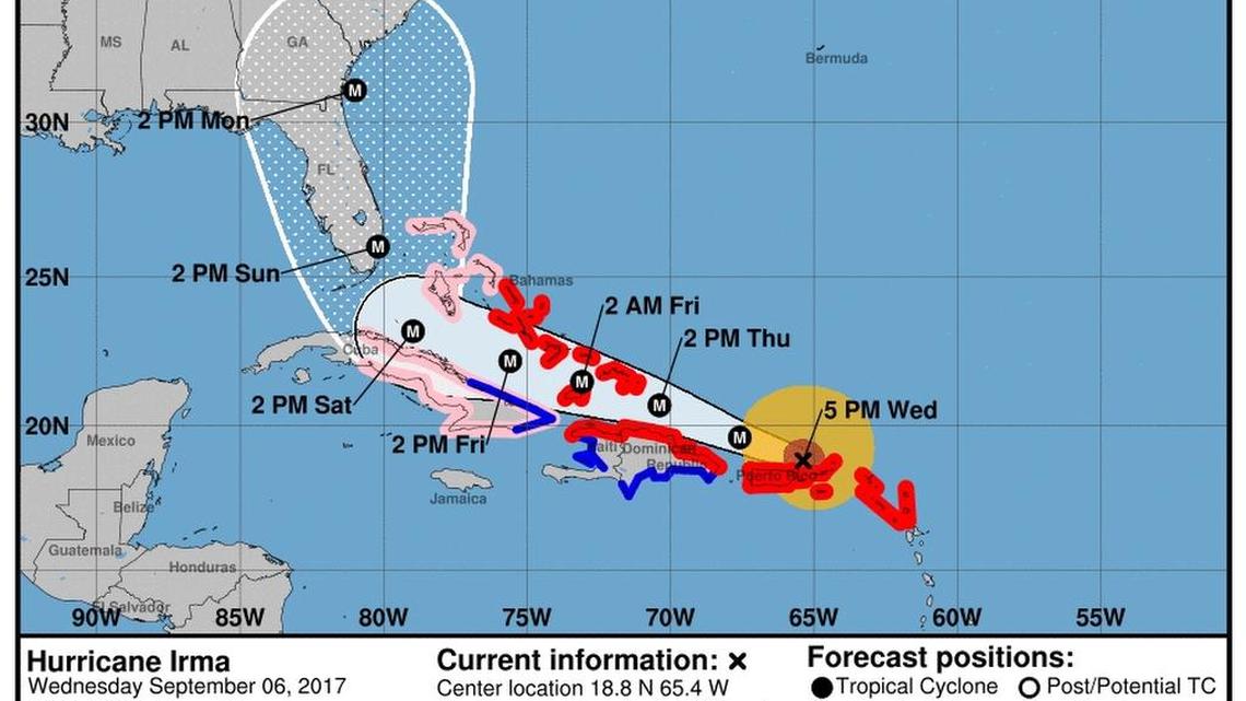 The eye of hurricane Irma is expected to pass just north of Puerto Rico Wednesday night and continue on its west-northwest track for the next couple of days, the National Hurricane Center said in its 5 p.m. update.