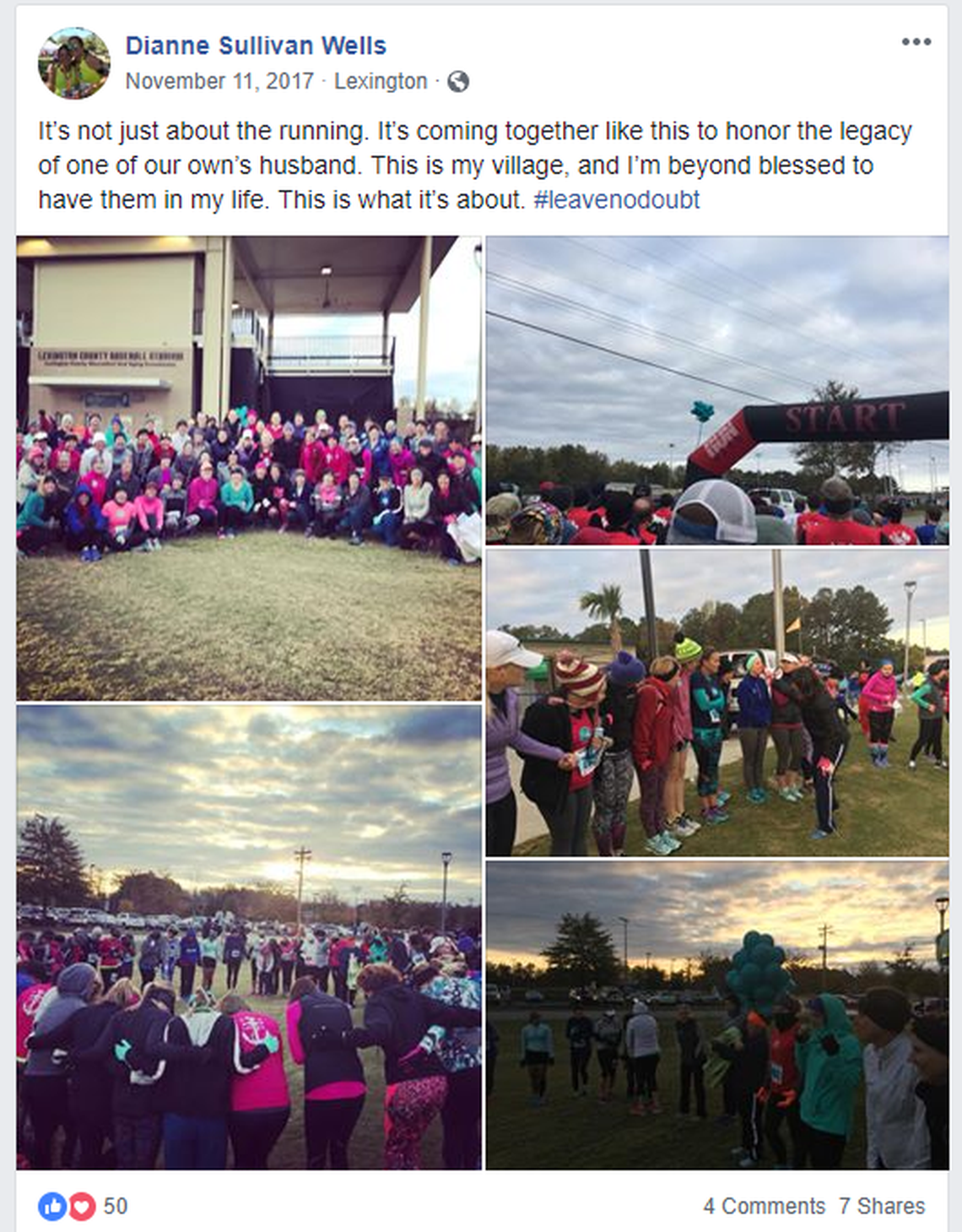 “It’s not just about the running,” she wrote. “It’s coming together like this to honor the legacy of one of our own’s husband. This is my village, and I’m beyond blessed to have them in my life. This is what it’s about.”