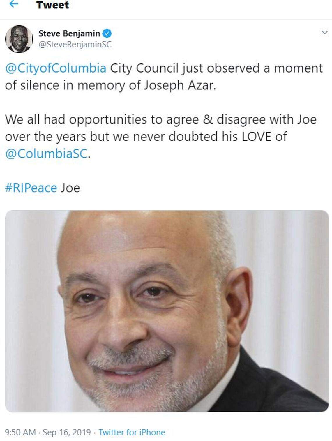 Carl Blackstone, president and CEO of the Columbia Chamber, in a tweet called Azar “opinionated and passionate in everything he believed in. Joe also loved Columbia, SC and he did his part to make it a better place to live. #RIP”