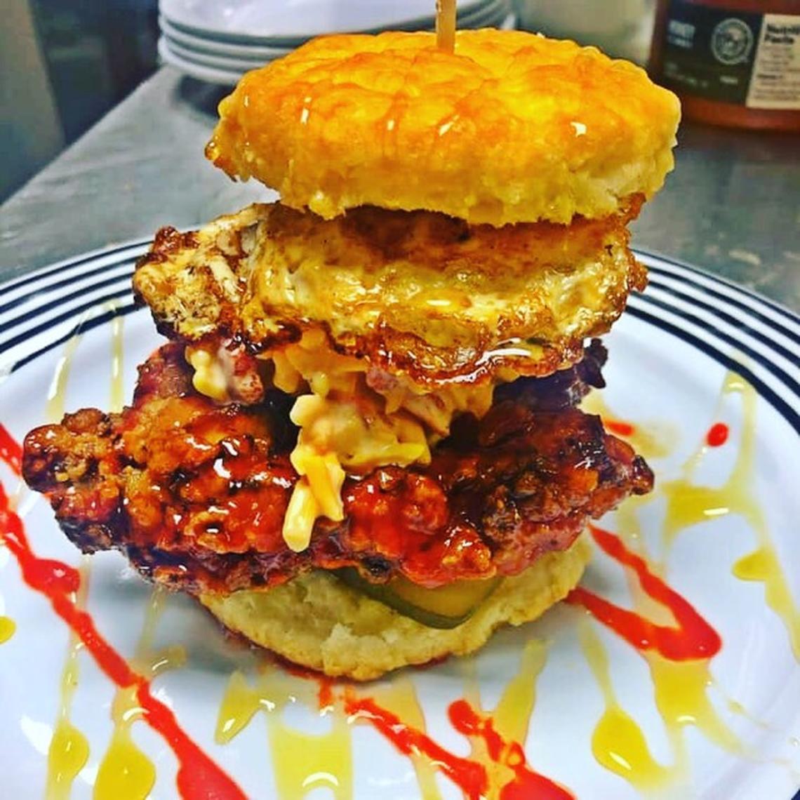 The restaurant features biscuit combos like Bubba’s Catch — a fried catfish biscuit with gravy and a fried egg, topped with pickles and habanero aioli drizzled with bang bang sauce.