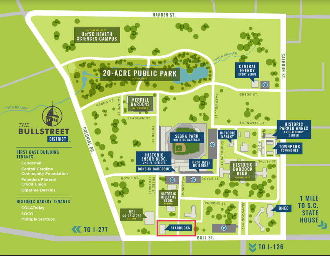 “I’m happy to report that Starbucks is coming, and it will be positioned perfectly to accommodate commuters as well as those who live and work in and near the district,” said Robert Hughes, president of Hughes Development Corp., the Greenville-based master developer of BullStreet, the name given to the 181-acre former state mental health hospital campus.