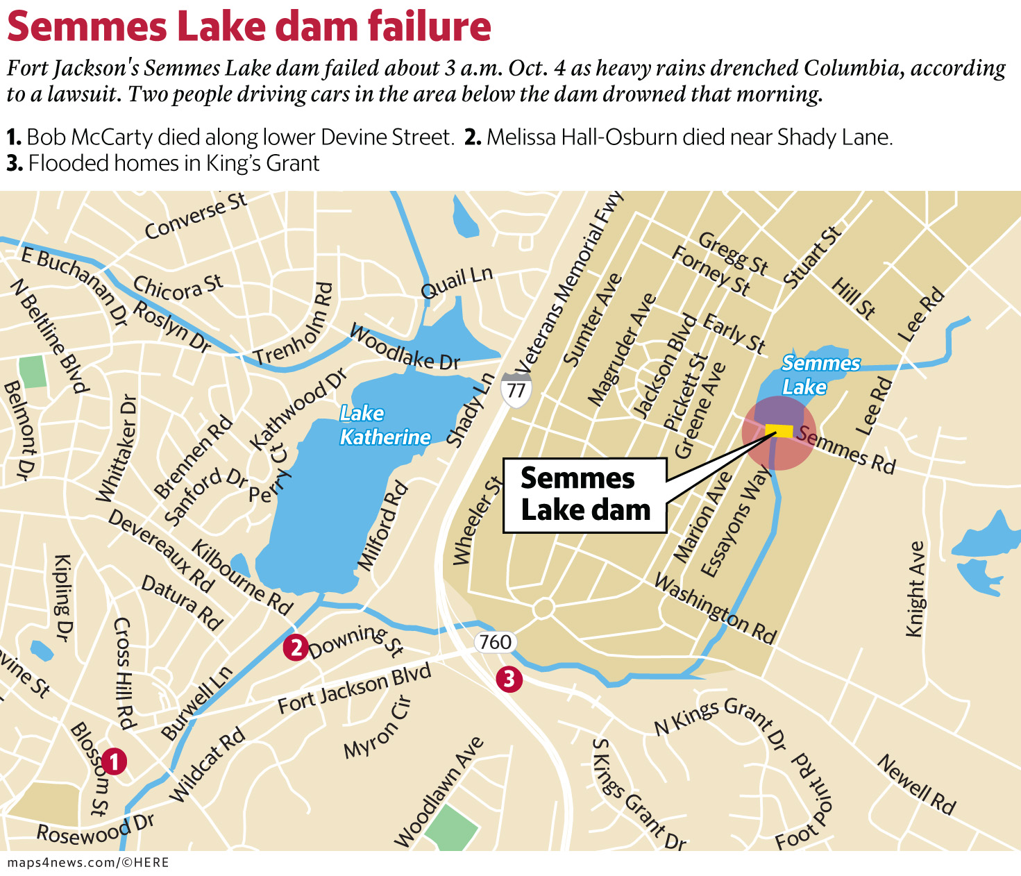 The Devine Street area was among the worst hit in Columbia during the October storm, which over several days dropped more than a foot and a half of rain in the Gills Creek watershed, which runs through the city. The flood caused property damage across the city and resulted in the deaths of nine people in the area. The only two deaths near Semmes Lake were those of McCarty and Hall-Osburn, who died about a mile away from the Army dam.