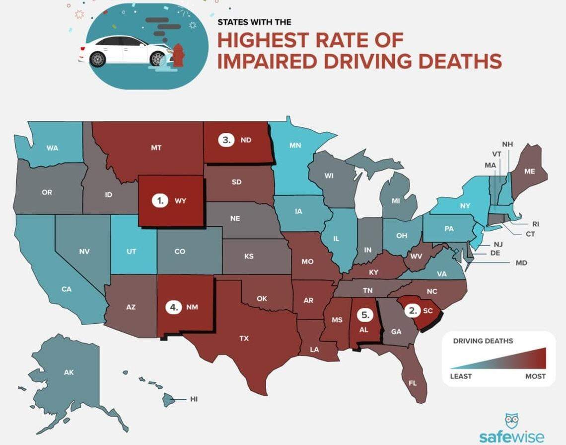 WACH reported on a study that showed the Palmetto State ranks second for most DUI fatalities in the United States. The ranking was based on 2017 data. In that year, South Carolina experienced 6.22 impaired driving deaths per 100,000 people, the study showed.