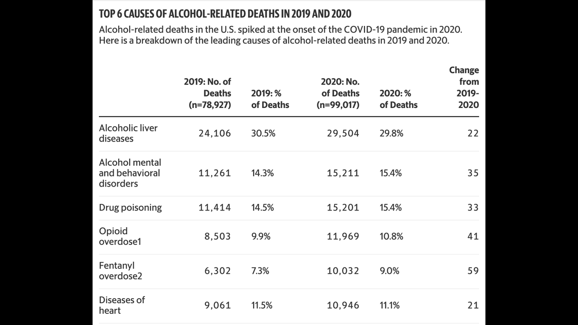 A death is considered alcohol-related when alcohol is determined to be the main cause or one of 20 contributing factors in a person’s death, White said. The top causes of alcohol-related deaths in 2020 were from liver diseases, mental and behavioral disorders related to alcohol, and drug poisoning involving alcohol, according to statistics from the National Institute on Alcohol Abuse and Alcoholism.