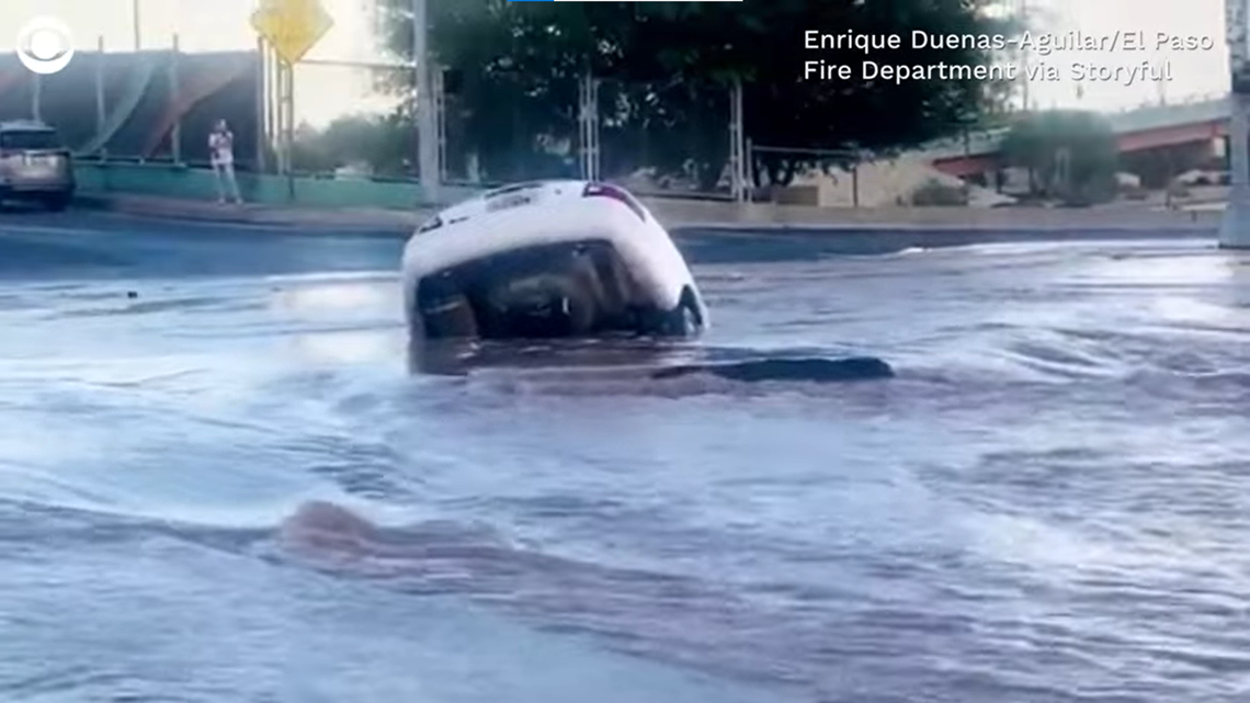 A group of about 10 people – firefighters and bystanders – gathered around the bumper of a white car, already partially submerged in the water-filled sinkhole, video taken on Aug. 9 by Enrique Duenas-Aguilar, the public information officer with the El Paso Fire Department, showed.