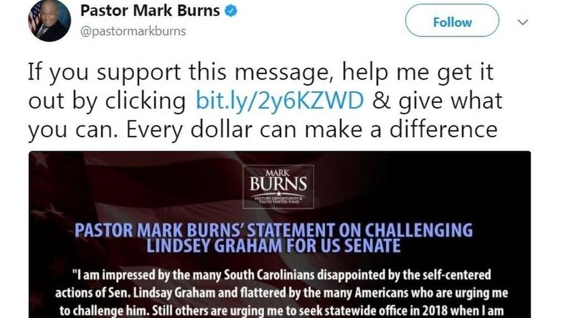 Mark Burns, an Easley pastor who became a regular at Donald Trump’s campaign appearances last year, posted a statement on Twitter thanking the “many Americans” who were encouraging him to challenge South Carolina’s senior senator in 2020 because of the “self-centered actions of Sen. Lindsey Graham.”