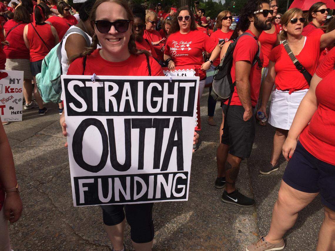 Aja Talbot-Modansky, 40, who teaches at arts-infused Windsor Hill Elementary School in North Charleston, held a black-and-white NWA style “Straight Outta Funding” sign.