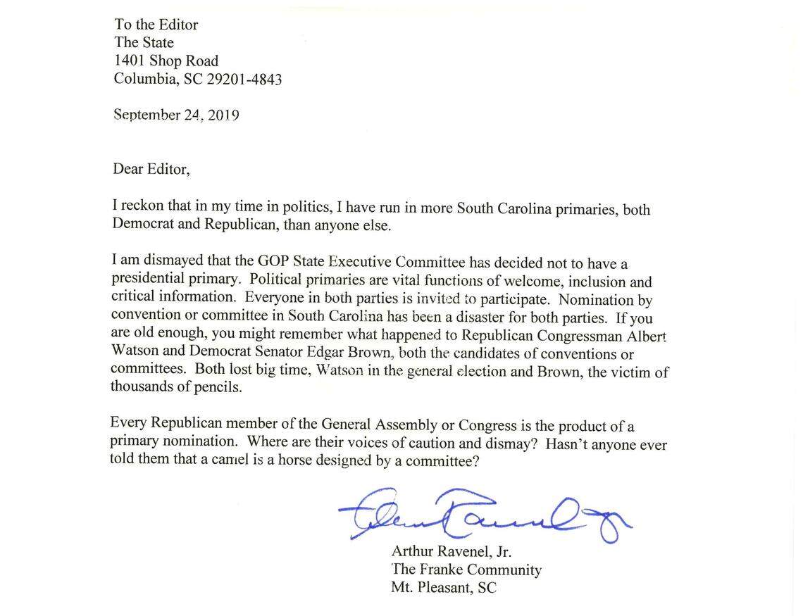 “Political primaries are vital functions of welcome, inclusion and critical information,” Ravenel wrote. “Nomination by convention or committee in South Carolina has been a disaster for both parties.”