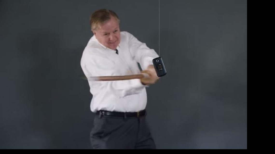 In slow motion, Graham is shown destroying flip phones with a meat cleaver, wooden samurai sword, blender, golf club, brick and toaster. Graham also burns a lighter fluid-soaked phone and drops another from a rooftop.