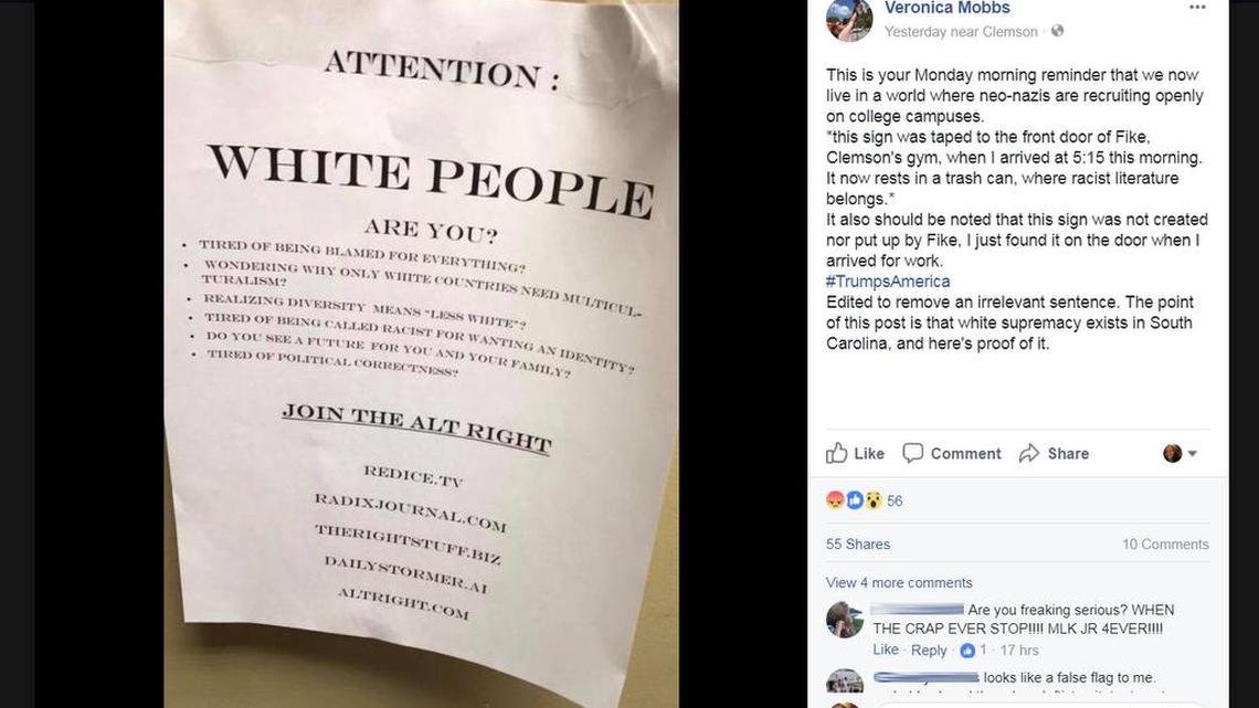 ‘Alt right’ recruitment flier seeking ‘white people’ found at Clemson University