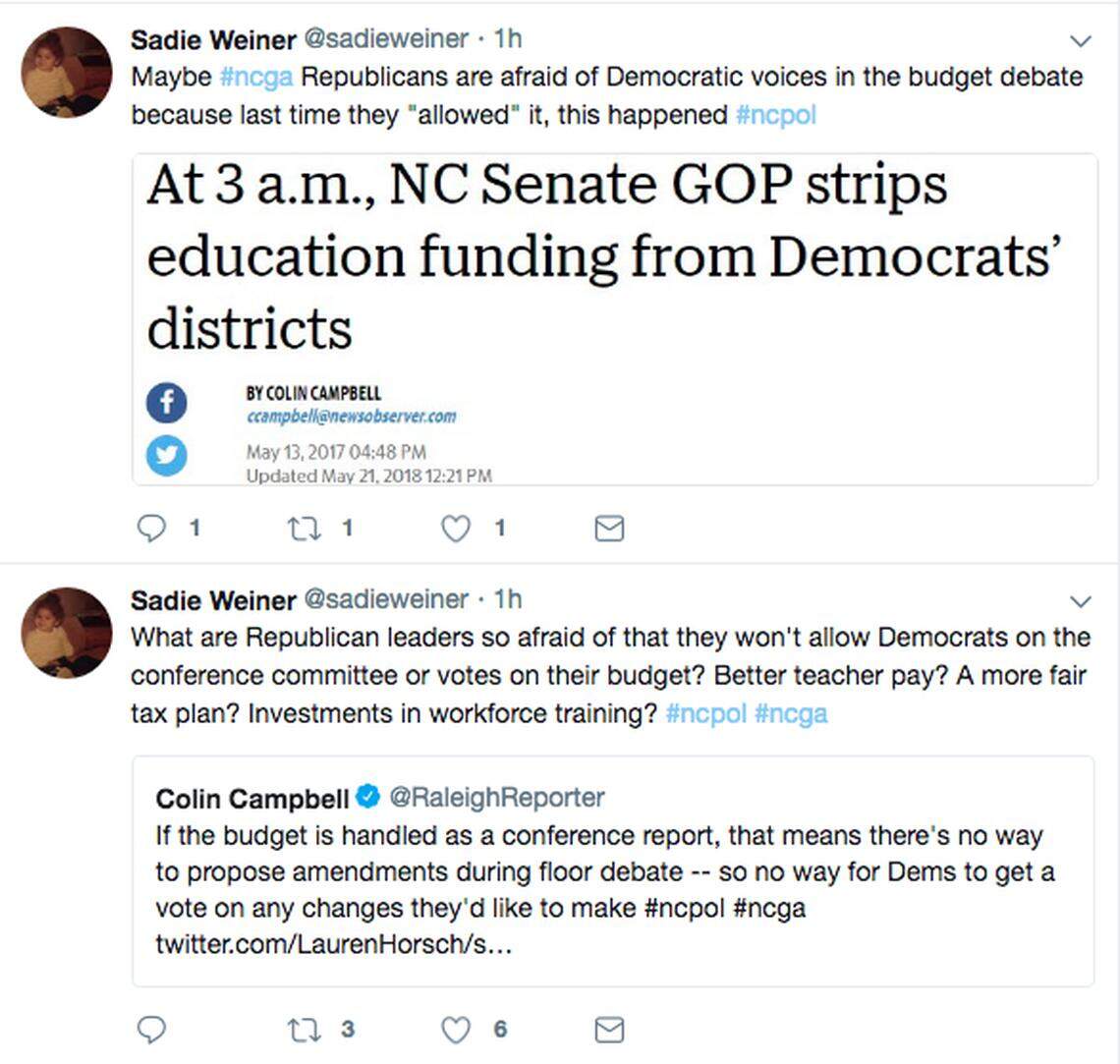 Sadie Weiner, Gov. Roy Cooper's communications director, used her Twitter account to ask Republicans what they have to hide. She then referenced a night last year when they stripped education funding from schools in Democrats' districts. Those cuts were restored in the final budget deal.