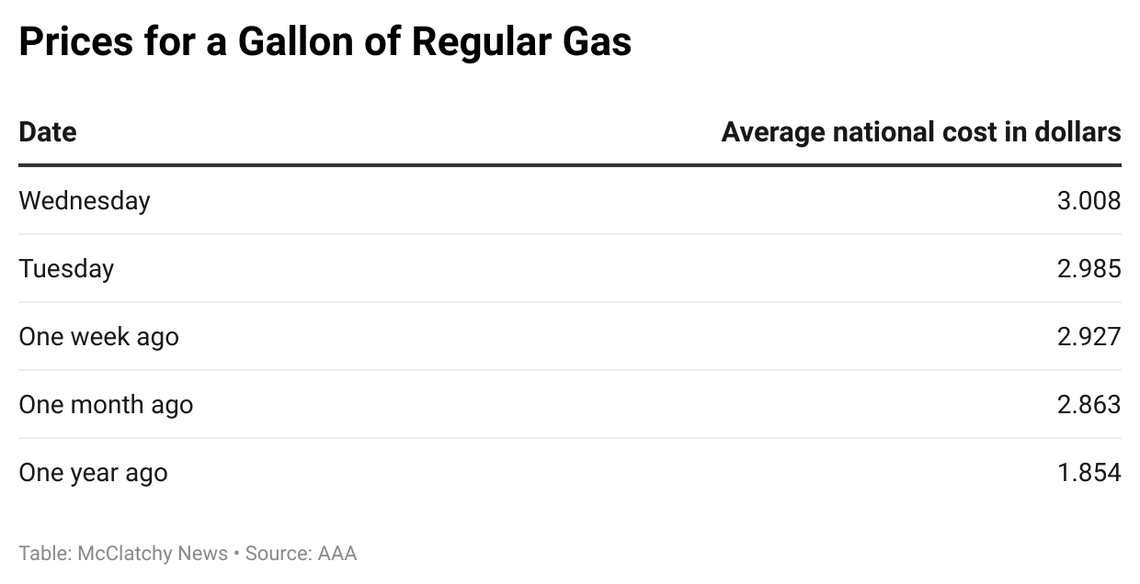 As of Wednesday, Americans were paying just over $3 a gallon on average for regular gas. That’s up from $2.985 the day before and $2.863 the previous month, AAA said.