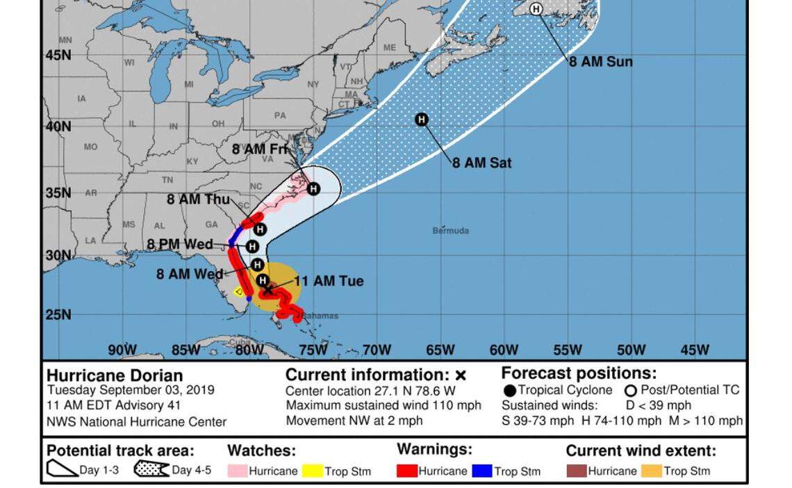 “Life-threatening storm surge and dangerous winds are expected along portions of the Florida east coast and the coasts of Georgia and South Carolina, regardless of the exact track of Dorian’s center,” the National Hurricane Center said in its 11 a.m. briefing Tuesday.