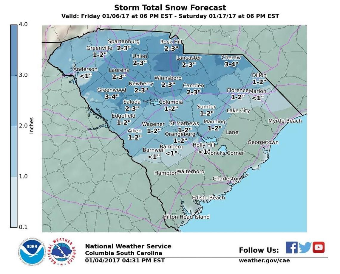 The National Weather Service reported the Pee Dee Region and the northern Midlands could get two to four inches of snow.