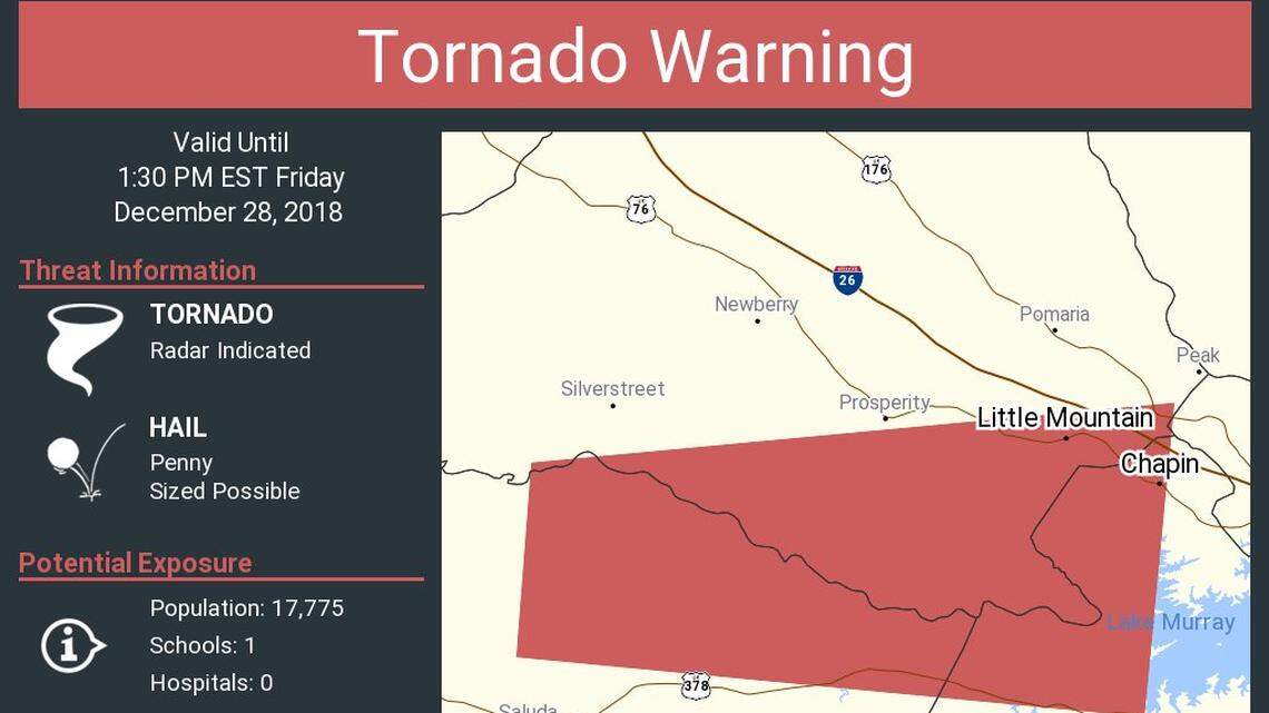 The tornado warning took effect at about 1 p.m., covering Newberry, Saluda and Lexington counties, according to the alert.